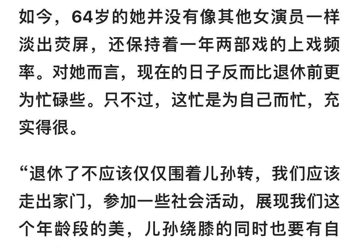 丈夫去世后,她决定让自己美美地活一次。一年拍好几部戏不说,有空还要出去旅游,全国各地都走遍了,她又办了签证,每年至少出国旅游一次。她总说年轻时没能好好享受,现在要一点点弥补回来。